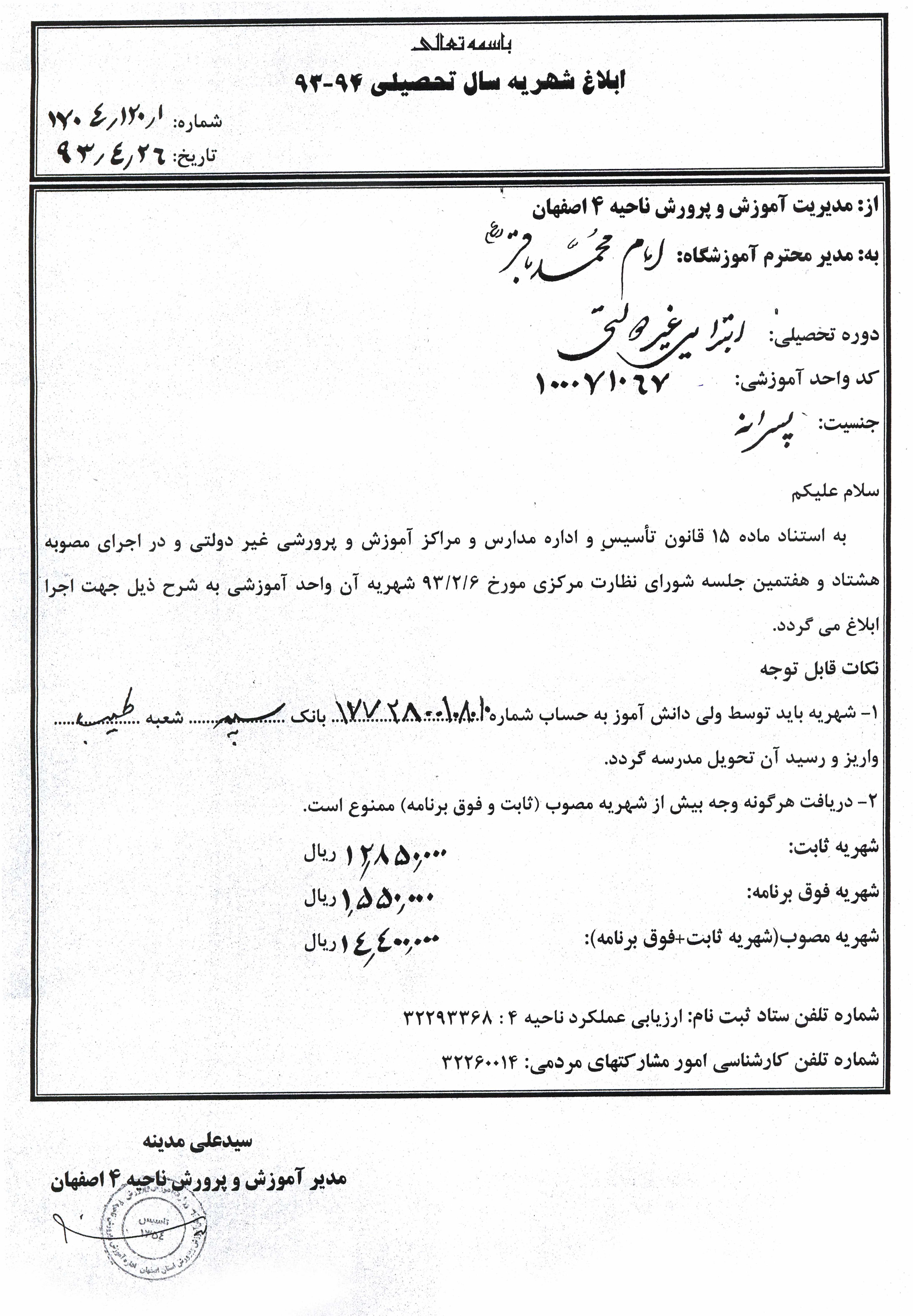 ابلاغ شهریه سال تحصیلی 94 - 93